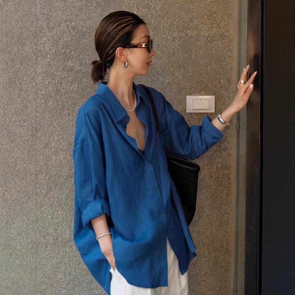 感亚麻防晒长袖衬衫松弛感百搭开衫外套薄款宽松棉麻蓝色衬衣