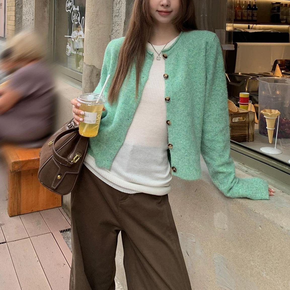针织开衫女韩系早秋穿搭外搭上衣氛围感绿色小香风毛衣外套2025