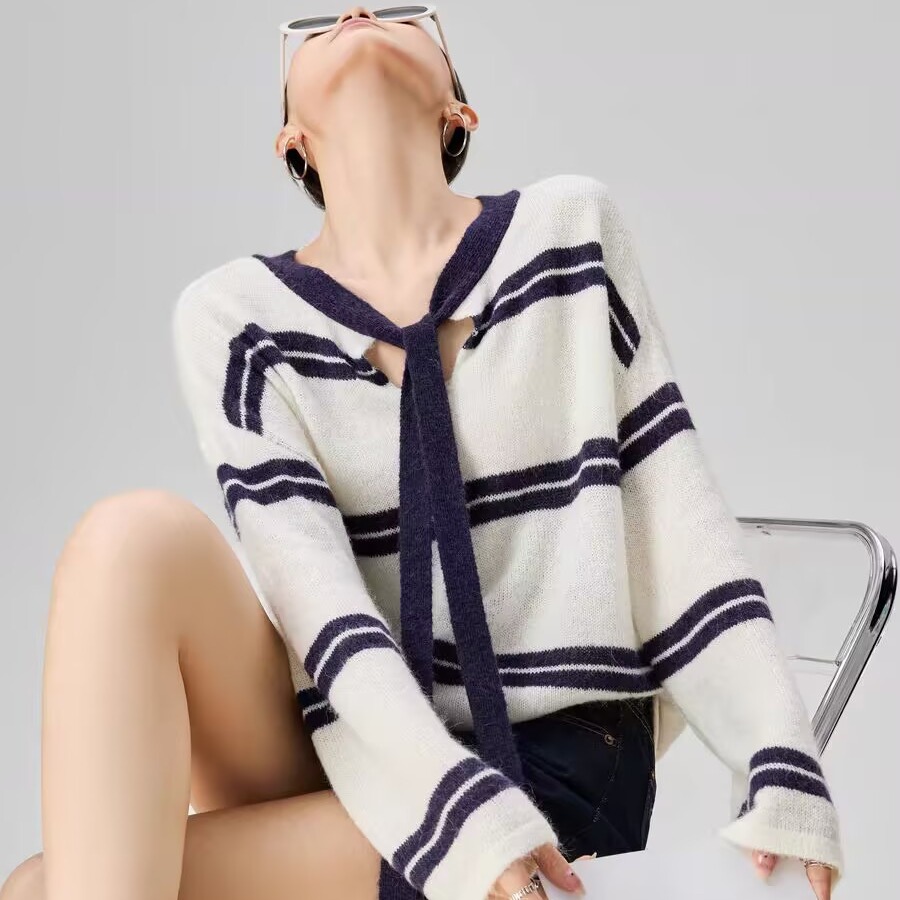 前后两穿马海毛撞色条纹系带长袖针织衫上衣女韩系早秋季穿搭小众