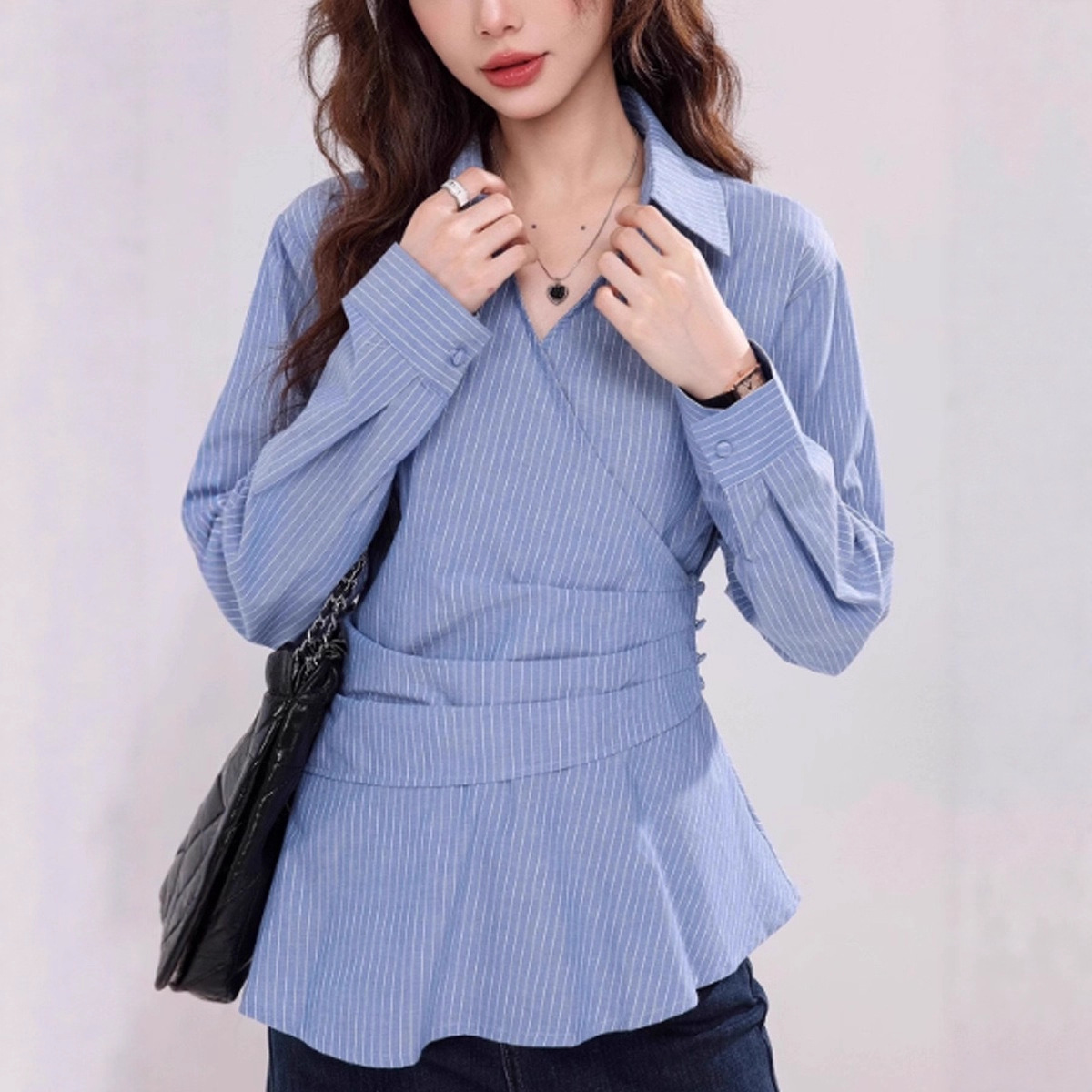 【古堡冒险家】蓝白条纹衬衫女2025秋新款设计感收腰长袖上衣