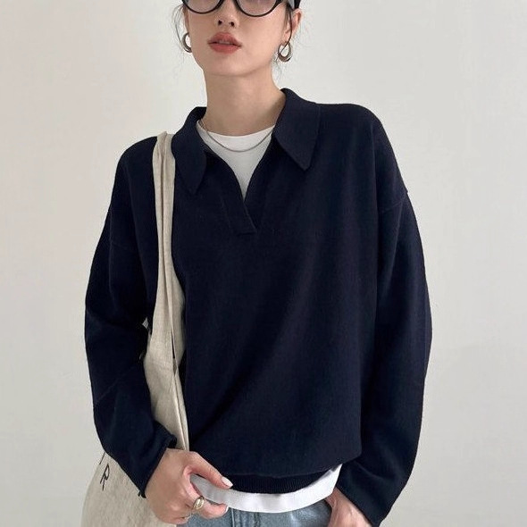 M1U老钱风polo针织衫春秋澳洲羊毛长袖宽松毛衣女