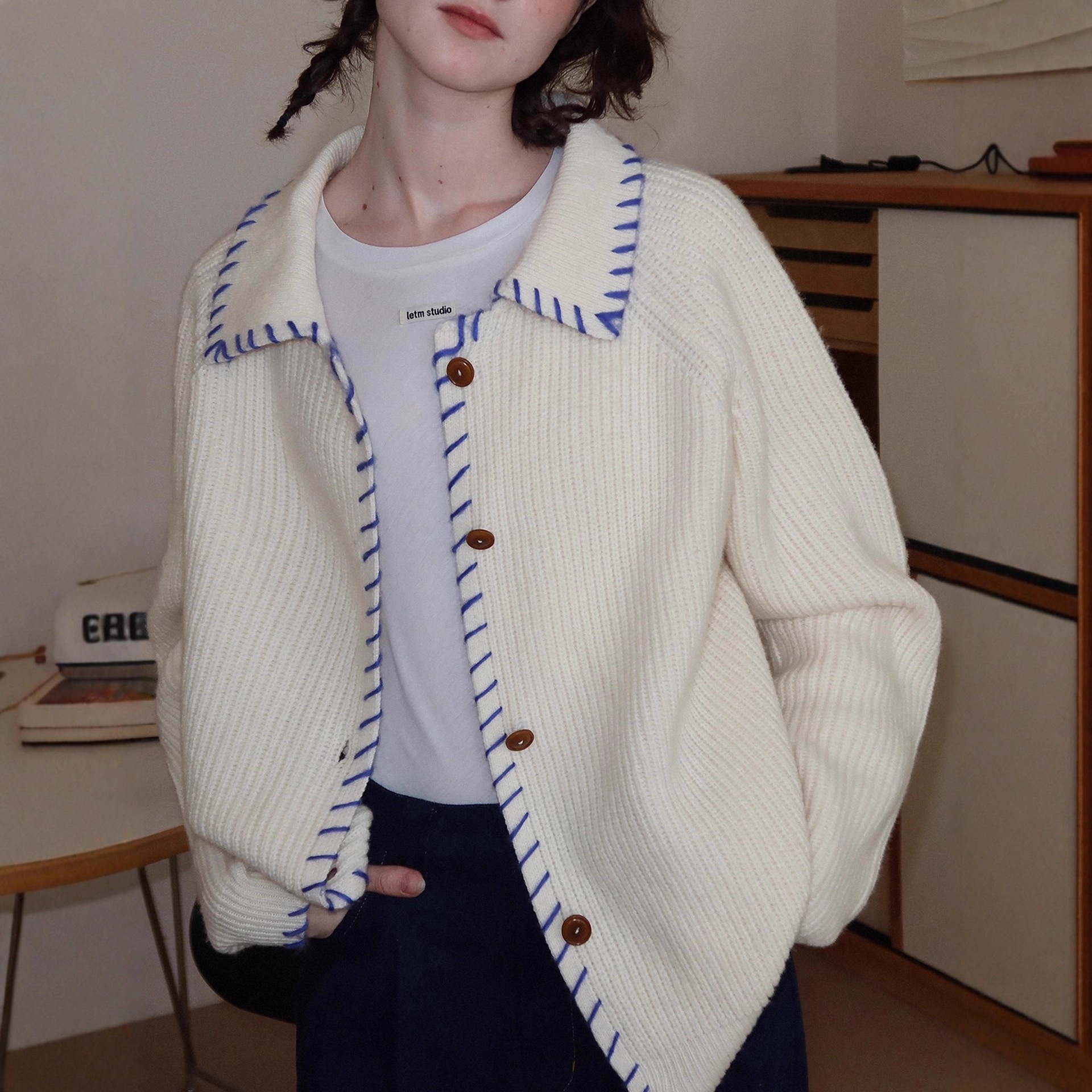 撞色圆领软糯针织外套女秋季慵懒风减龄百搭气质短款毛衣