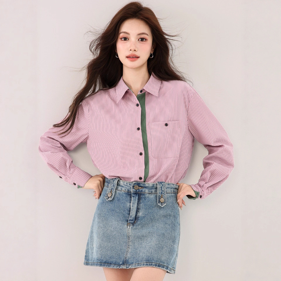 鹿西港风气质条纹衬衫女春季慵懒宽松盐系外穿落肩袖衬衣外套3101
