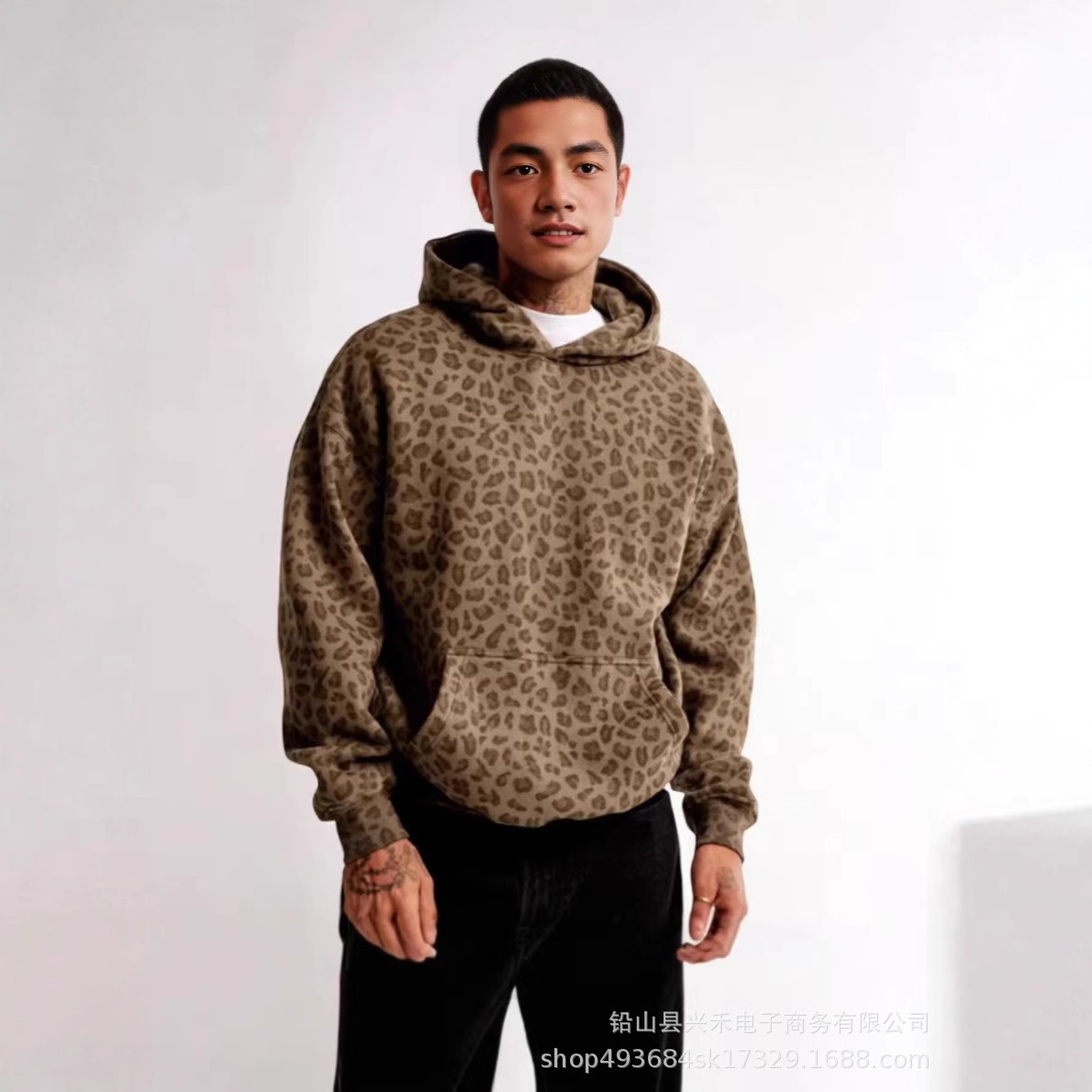 外贸跨境新款美式男女豹纹数码印花连帽衫宽松休闲潮流套头卫衣