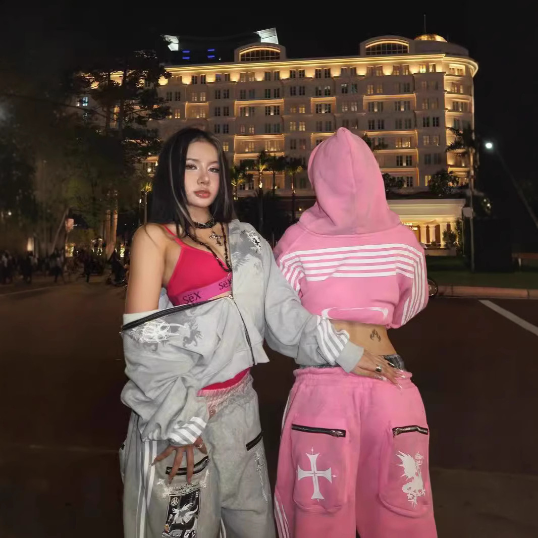 欧美复古设计感三条杠印花连帽衫潮牌街头拉链宽松修身男女款卫衣