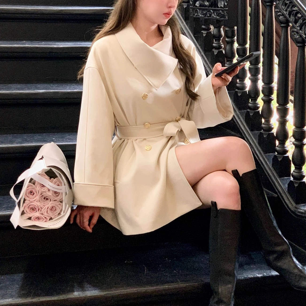 韩系高智千金感系带收腰短款风衣白色外套女高级感长款大衣秋