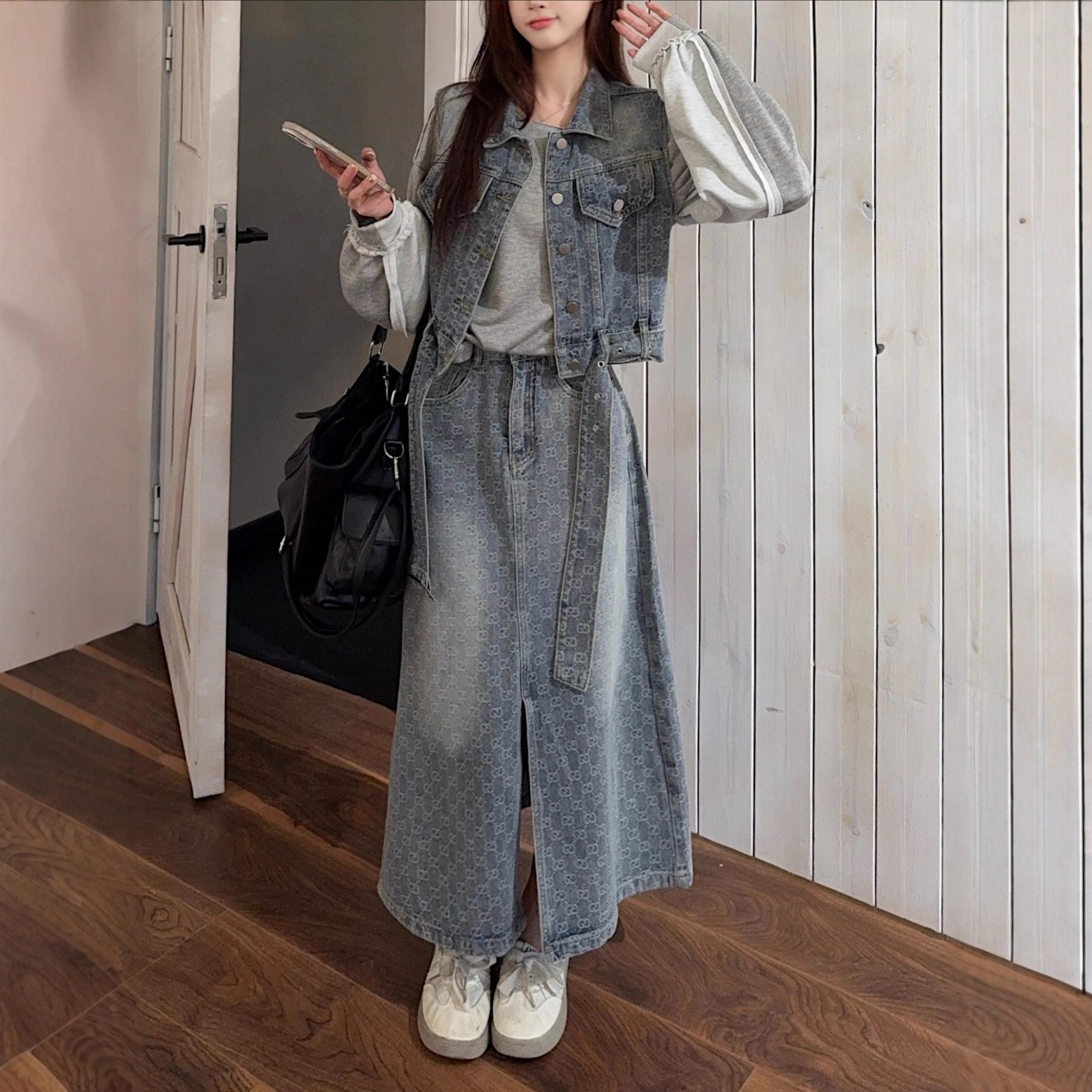 复古无袖坎肩港风复古牛仔套装裙女短款马甲上衣新款半身裙两件套