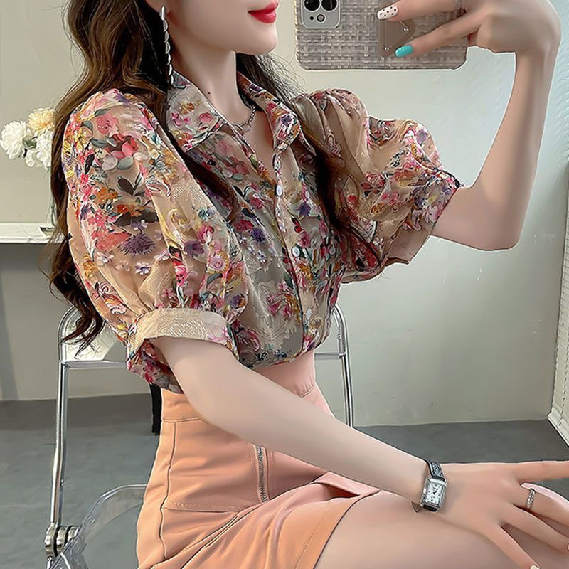 新中式碎花雪纺衫上衣女夏衬衣夏季新款气质显瘦减龄外搭衬衫