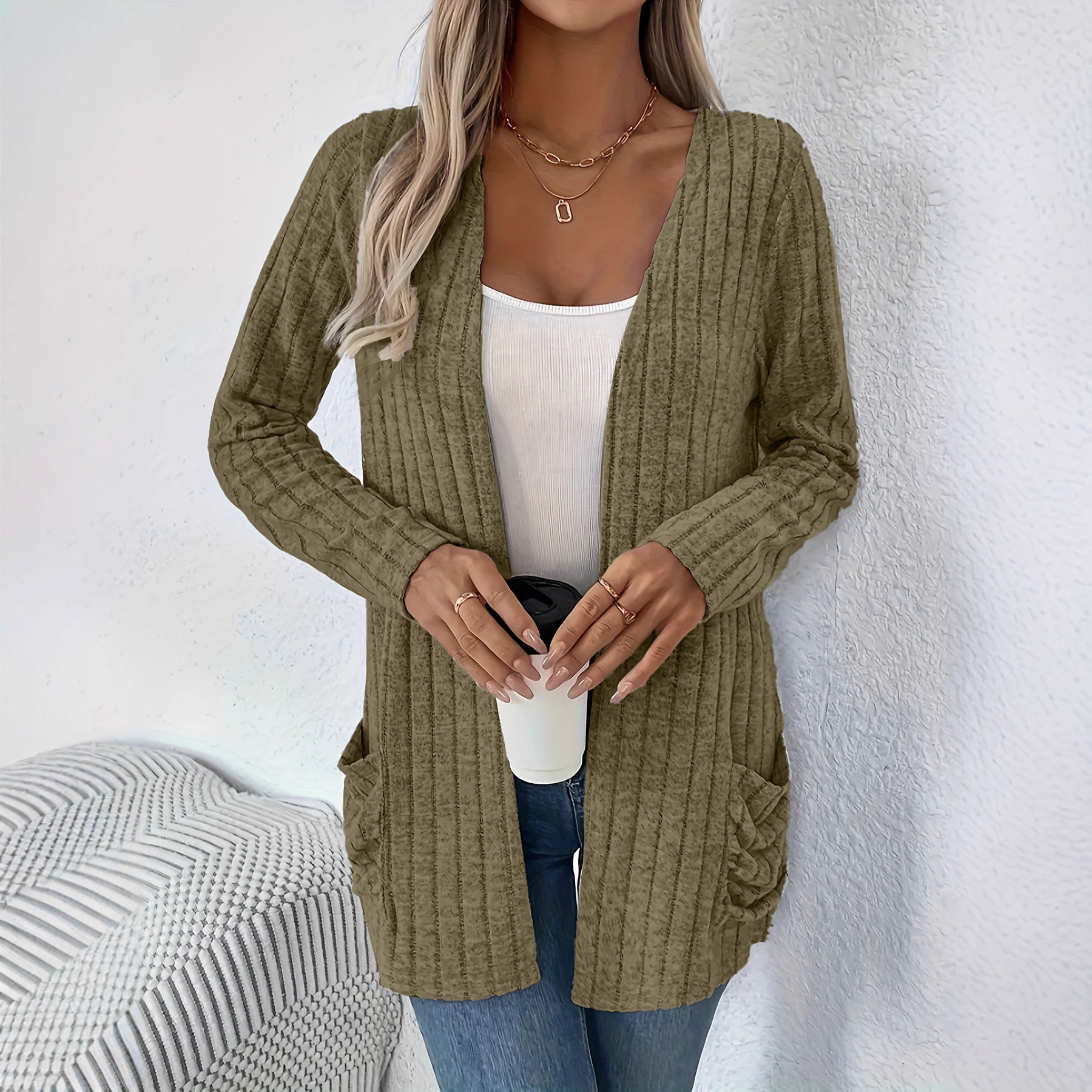亚马逊2025年欧美跨境外贸秋冬纯色宽松长袖口袋开衫外套女装新款