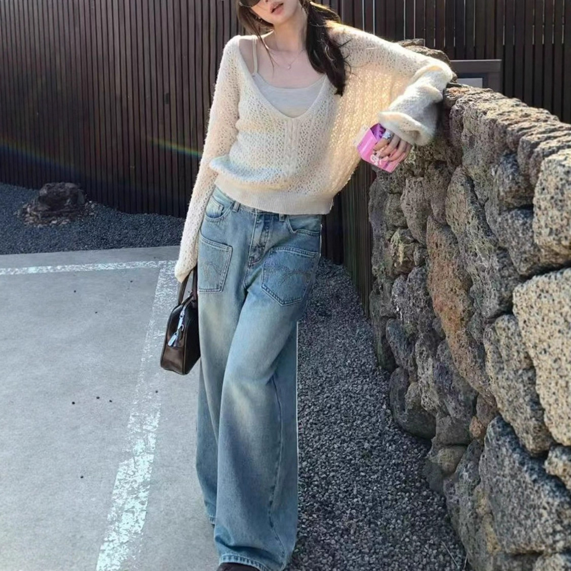 超火两件套首尔假期v领长毛马海镂空上衣女秋绞花针织罩衫两件套