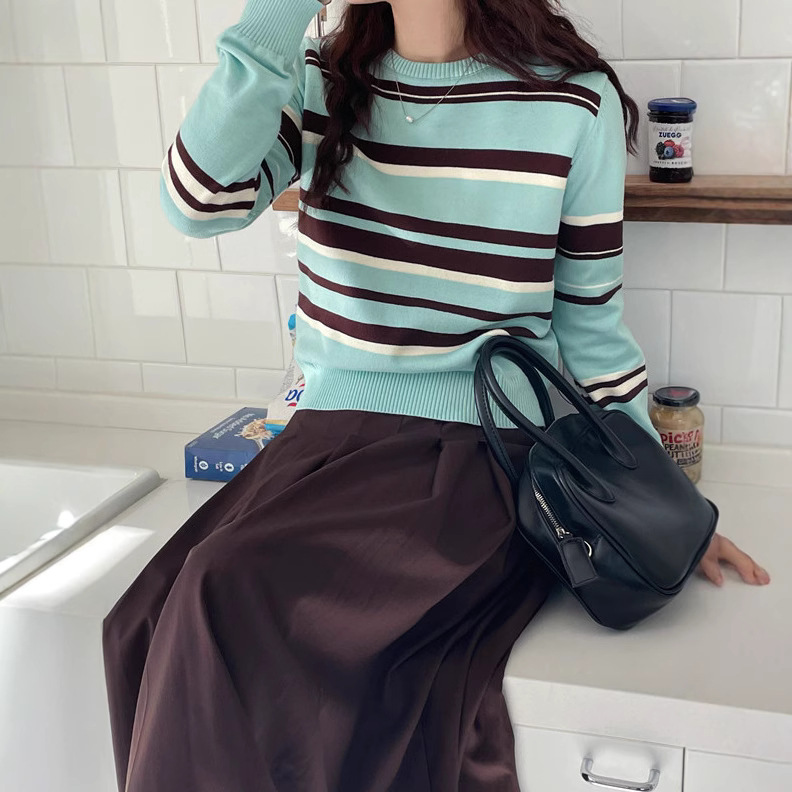 新款韩版复古显白条纹防晒衫垂感宽松显瘦休闲秋季撞色条纹圆领长