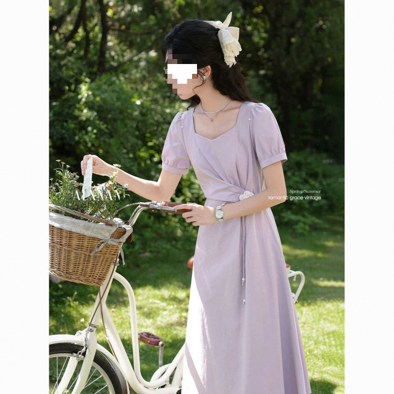 紫色法式方领连衣裙女夏季新款气质收腰长裙子