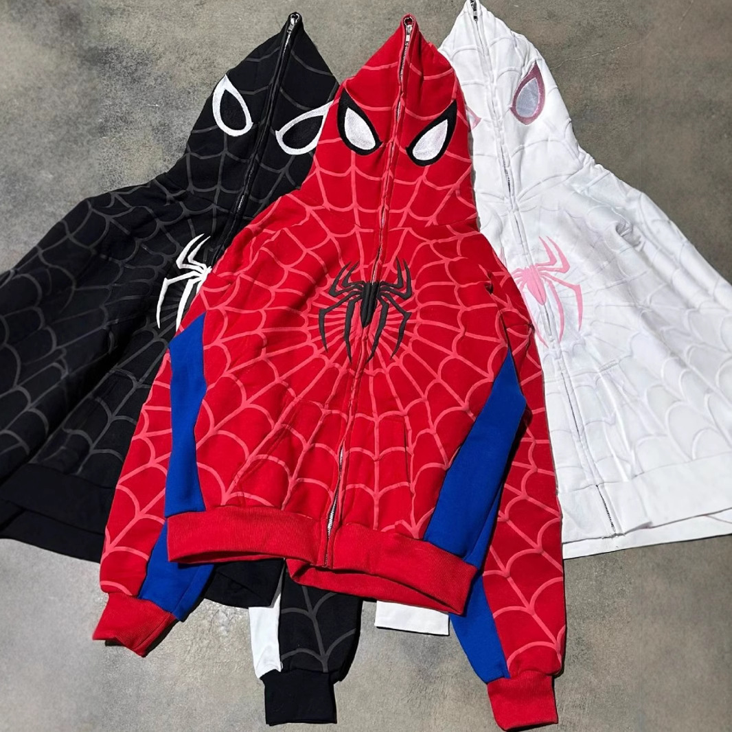 欧美跨境新款哥特暗黑蜘蛛印花连帽开衫全链宽松男女潮牌卫衣外套