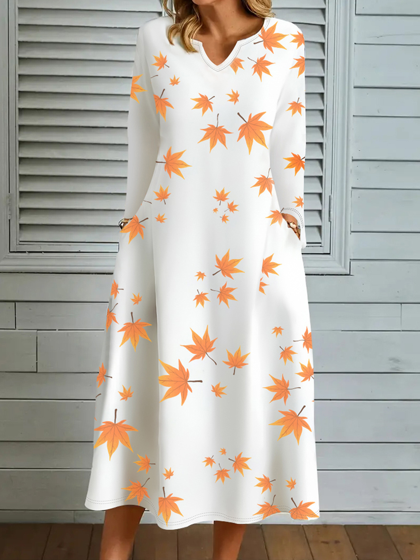 2024欧美新款跨境数码枫叶印花长袖V领大摆连衣裙女