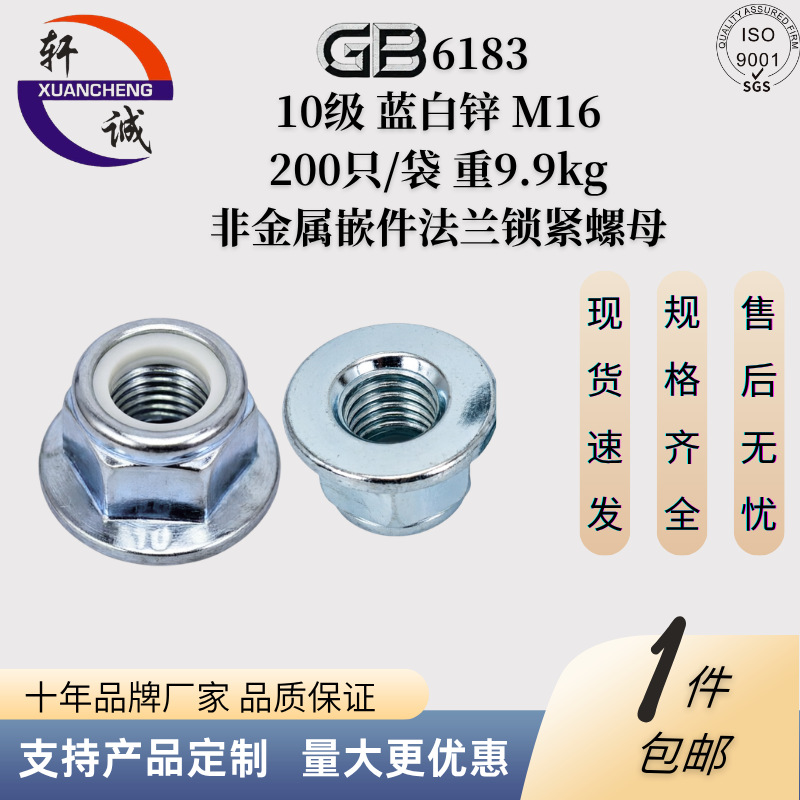 GB6183 10级蓝白锌M16 包邮 非金属嵌件六角法兰面锁紧螺母