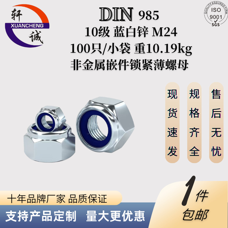 DIN985 非金属嵌件锁紧薄螺母 10级蓝白锌M24 冷镦成型 螺纹清晰