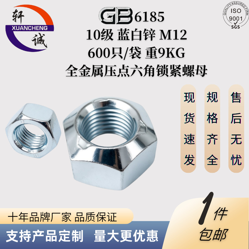 GB6185 1型压点式六角锁紧螺母 M12 10级蓝白 冷镦成型 螺纹清晰