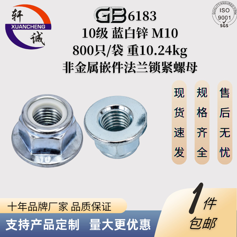GB6183 10级蓝白锌M10 包邮 非金属嵌件六角法兰面锁紧螺母