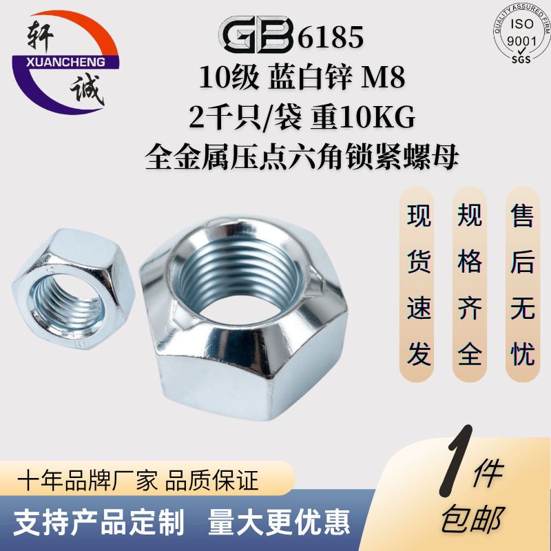 GB6185 1型压点式六角锁紧螺母 M8 10级蓝白 冷镦成型 螺纹清晰