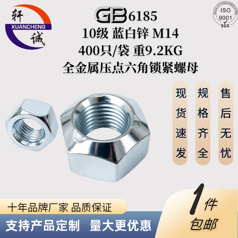 GB6185 1型压点式六角锁紧螺母 M14 10级蓝白 冷镦成型 螺纹清晰