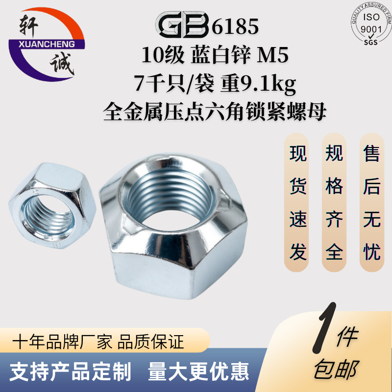 GB6185 1型压点式六角锁紧螺母 M5 10级蓝白 冷镦成型 螺纹清晰