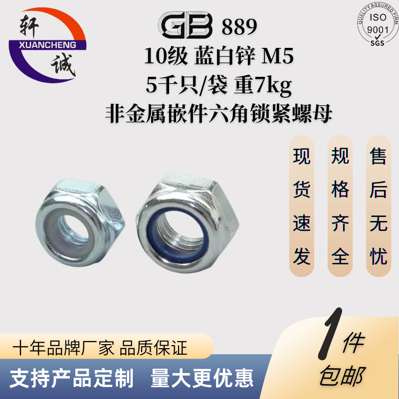 GB889 非金属嵌件六角锁紧螺母 10级蓝白锌M5 冷镦成型 螺纹清晰