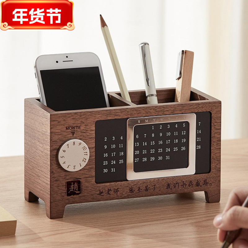 材质优良色泽温润黑胡桃木笔筒万年历木质收纳盒桌面办公室用品摆