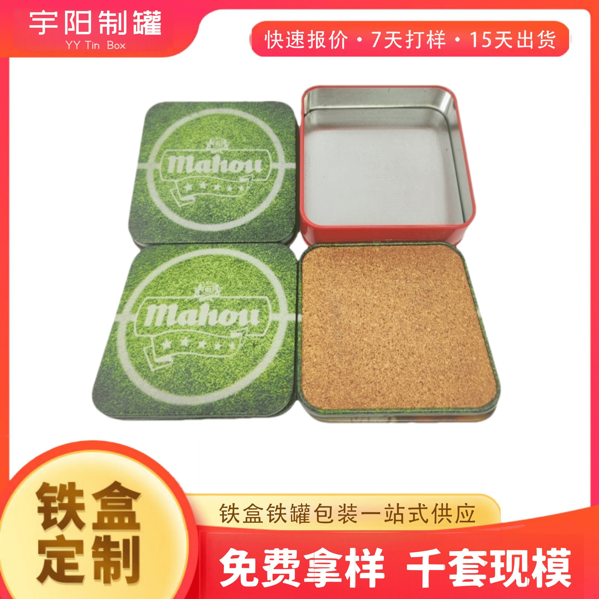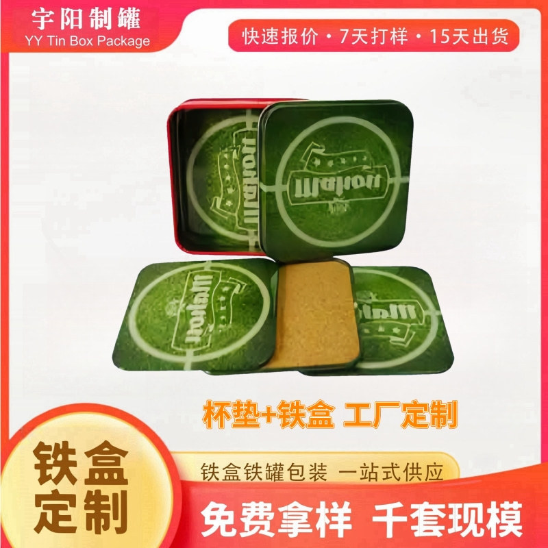 定制正方形杯垫铁盒 软木垫马口铁盒套装 桌面啤酒杯垫礼品金属盒