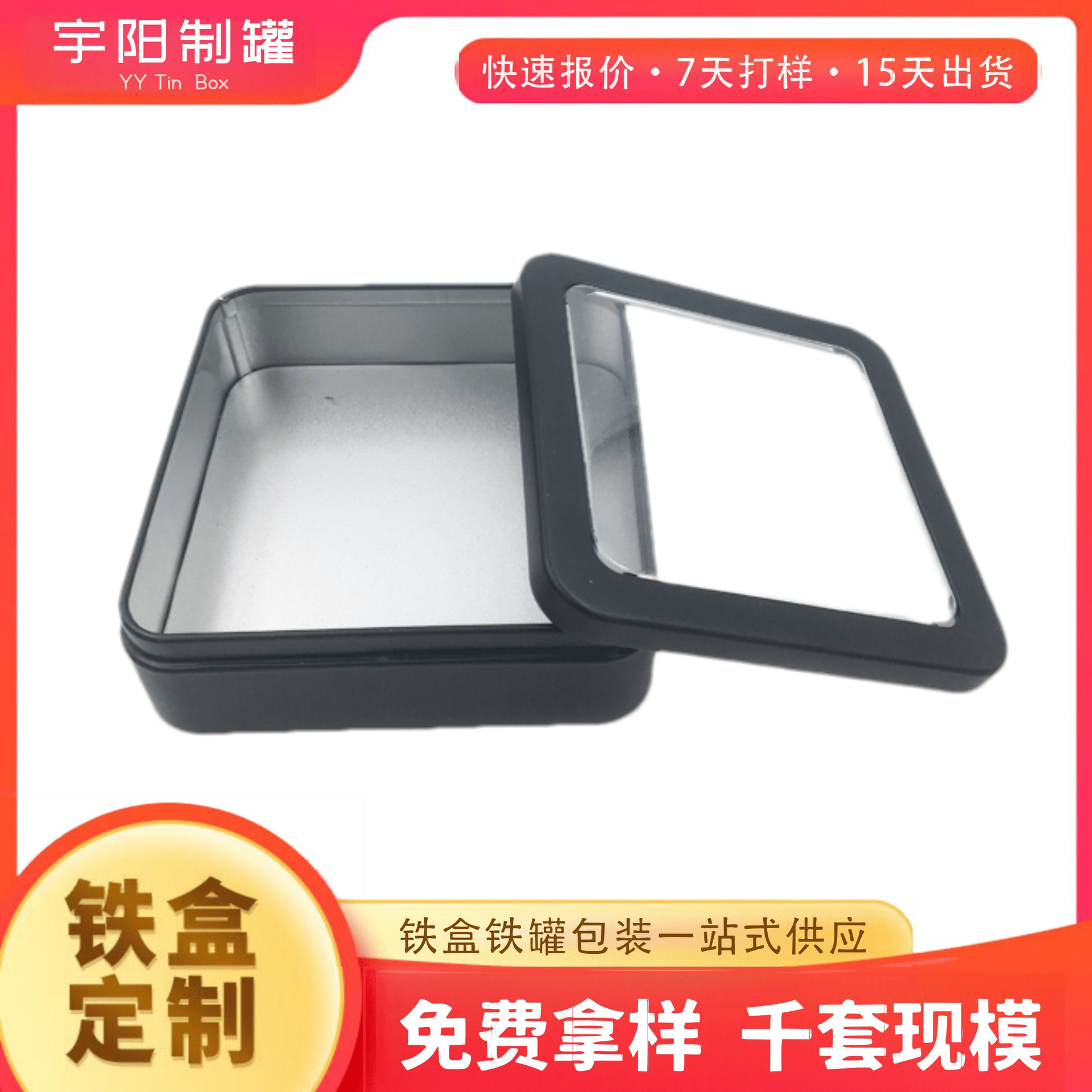 工厂定制长方形开窗铁盒圣诞礼品铁罐盖带PET窗口双面CMYK金属盒