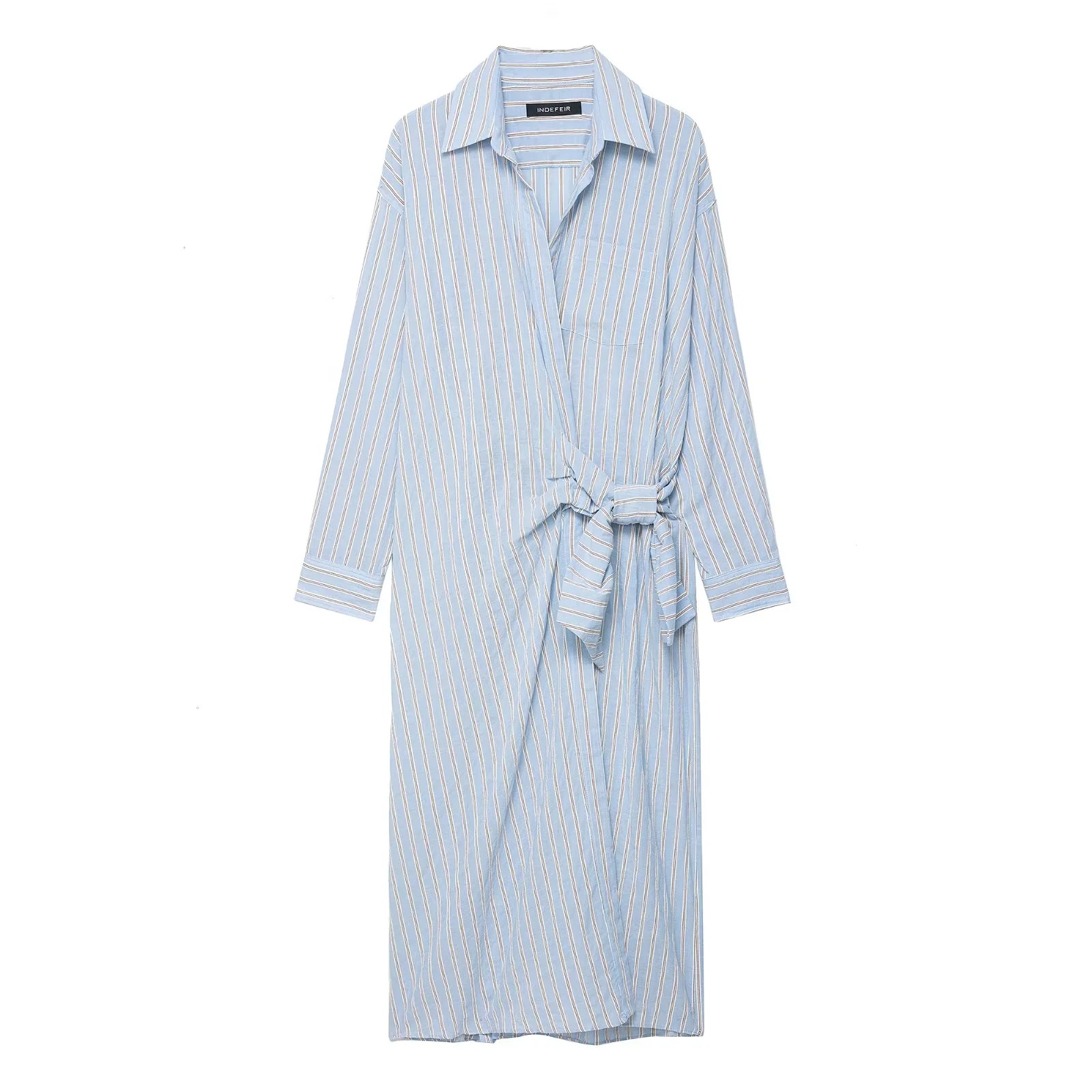 跨境欧美风秋季新款气质通勤翻领条纹结饰长袖双襟衬衫式连衣裙