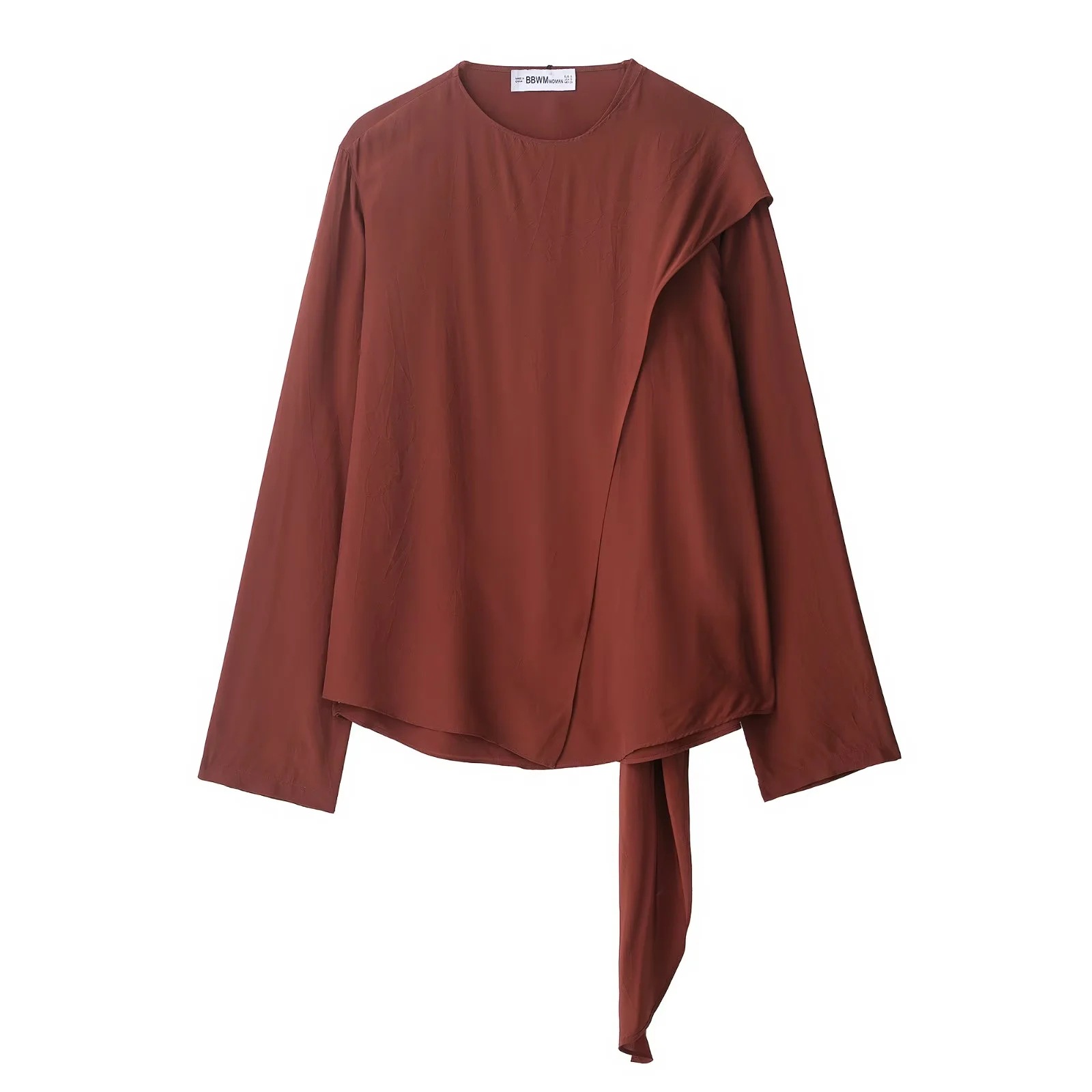 外贸批发2025秋季新款时尚简约结饰领口飘逸罩衫宽松长袖T恤上衣