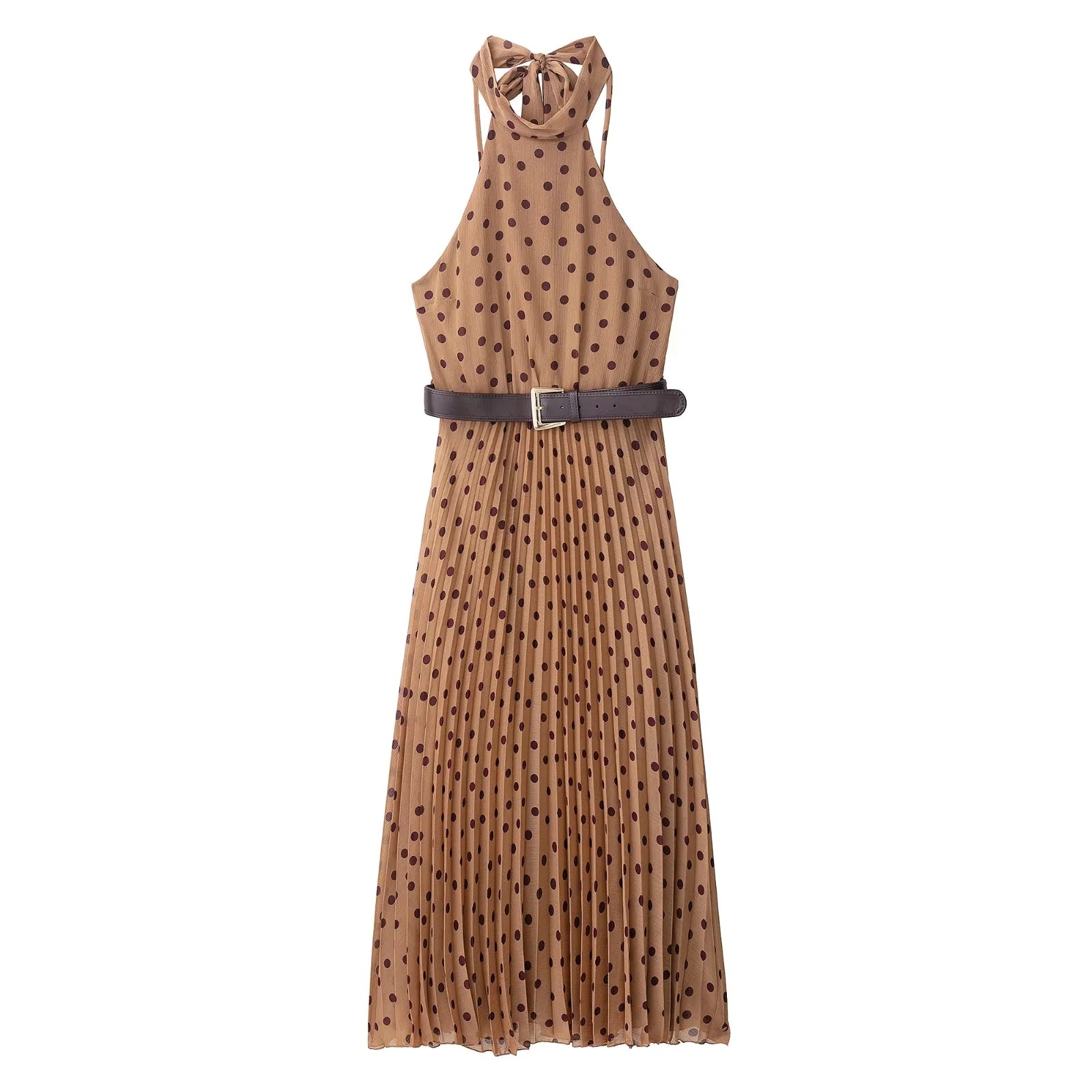 亚马逊跨境欧美风女装气质褶皱波点系腰带挂脖领无袖迷笛连衣裙