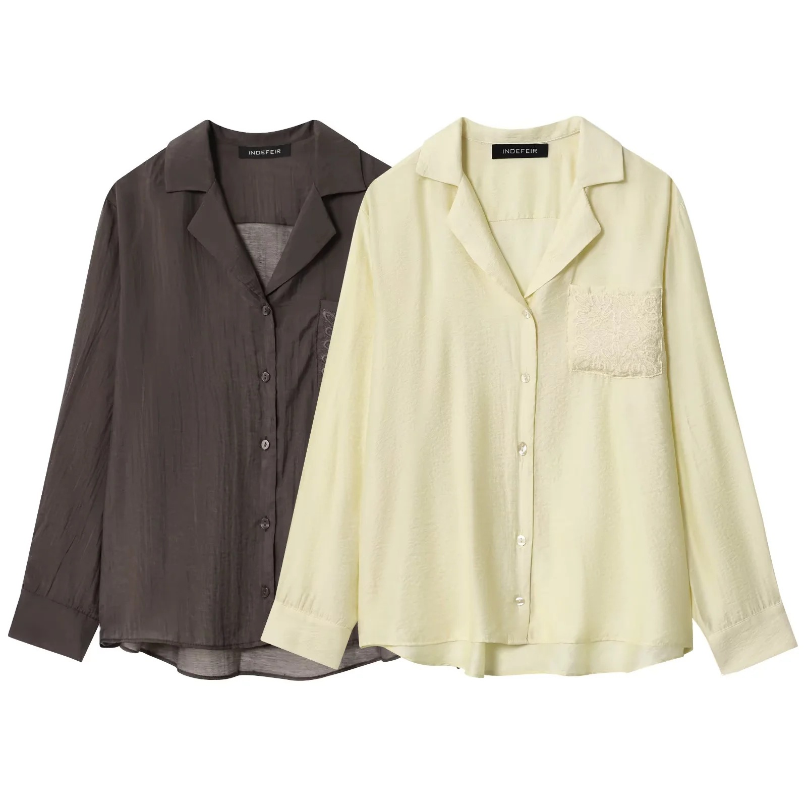 外贸批发2025秋季新款欧美女装气质通勤刺绣口袋饰长袖衬衫衬衣