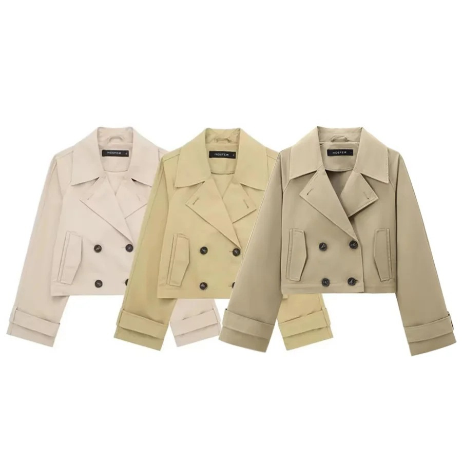 速卖通跨境2025秋季新款欧美风纽扣饰双襟短款风衣休闲百搭外套女