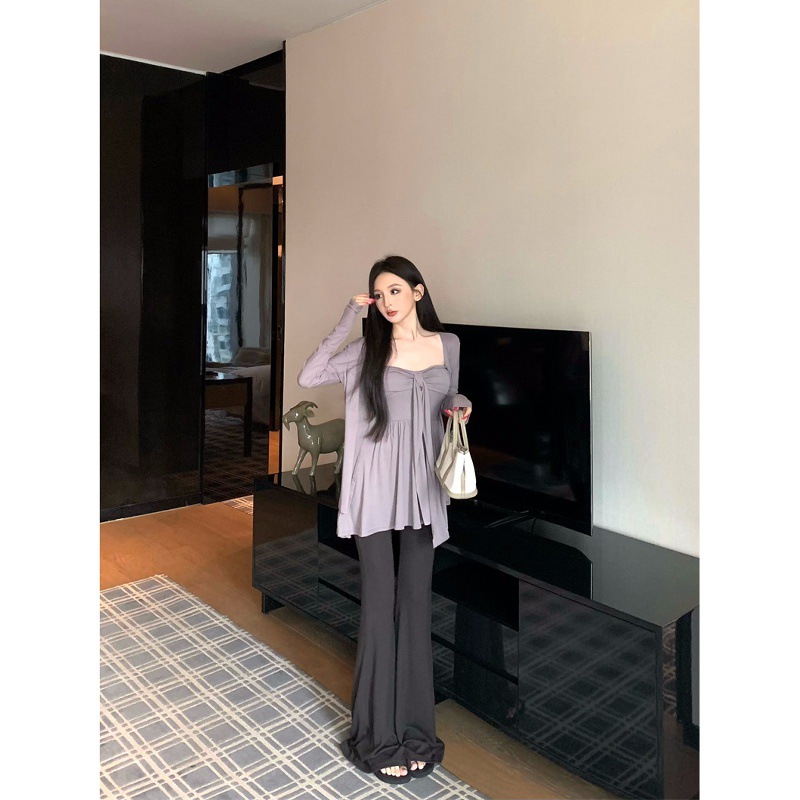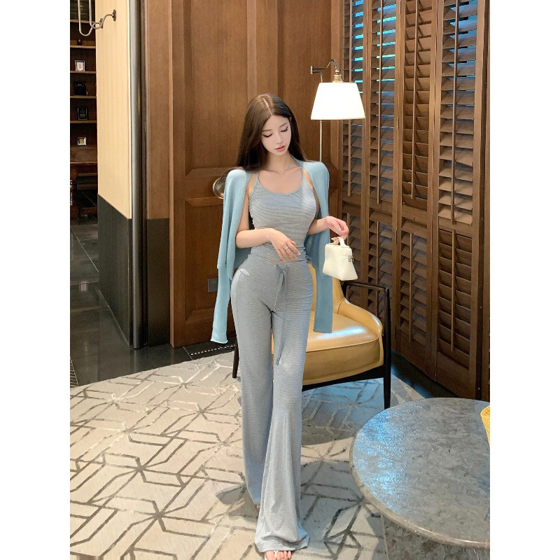 2025新款辣妹套装纯色长袖开衫女内搭背心秋季高腰微喇长裤三件套