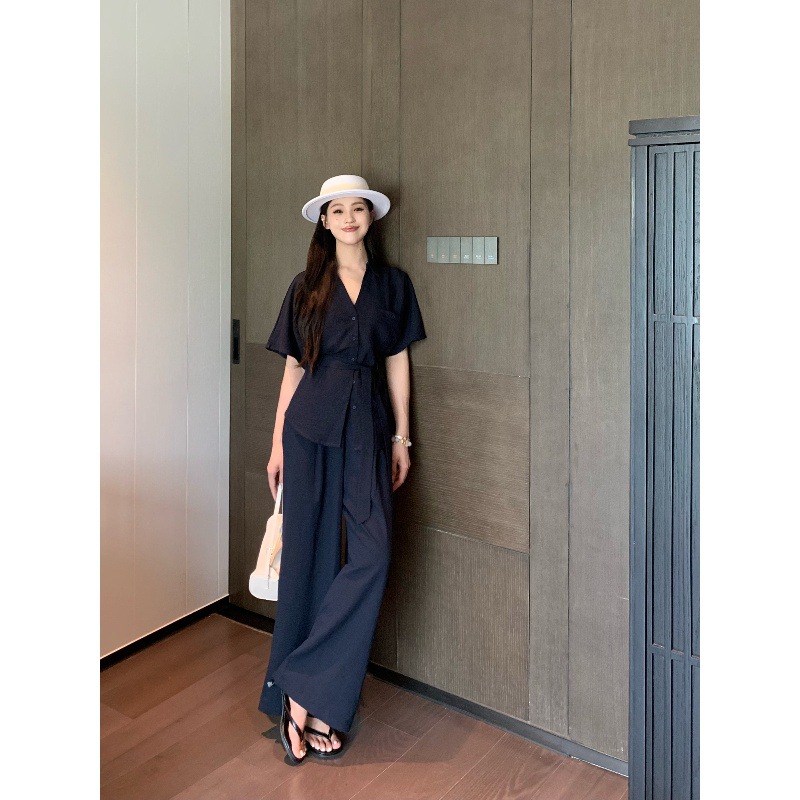 2025新款时尚套装纯色气质长袖衬衫女秋季高腰显瘦休闲长裤两件套