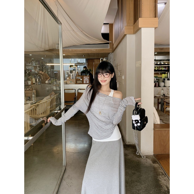 2025新款慵懒风套装条纹长袖T恤女内搭背心秋季高腰半身裙三件套
