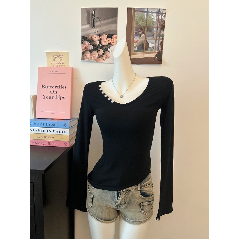 2025新款设计感白色半开领纽扣长袖T恤女装秋季别致减龄显瘦上衣