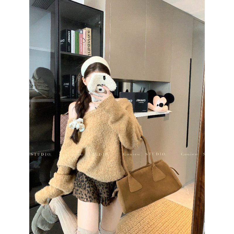 2025新款慵懒风浅灰色斜肩长袖卫衣女装秋季百搭休闲裤短裤两件套