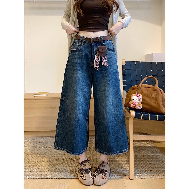 2025新款美式复古做旧水洗蓝色牛仔裤女秋季高腰显瘦阔腿裤七分裤