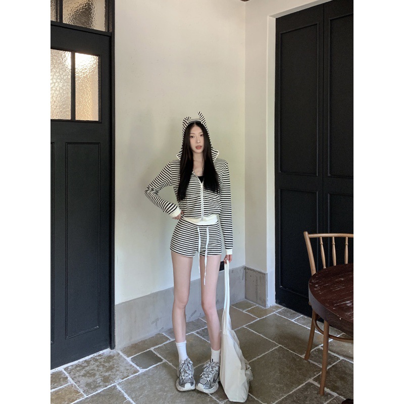 2025新款时尚套装撞色条纹长袖外套女秋季抽绳显瘦休闲短裤两件套
