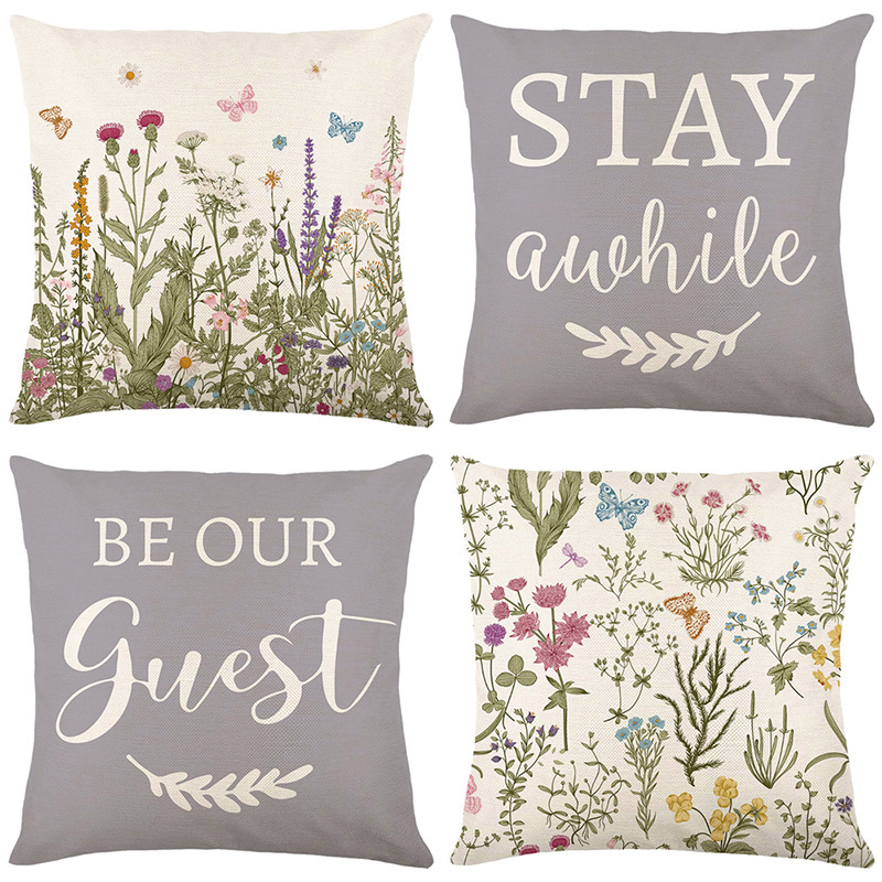 亚马逊新款春季花朵抱枕套亚麻印花字母沙发靠垫套跨境家居靠枕套