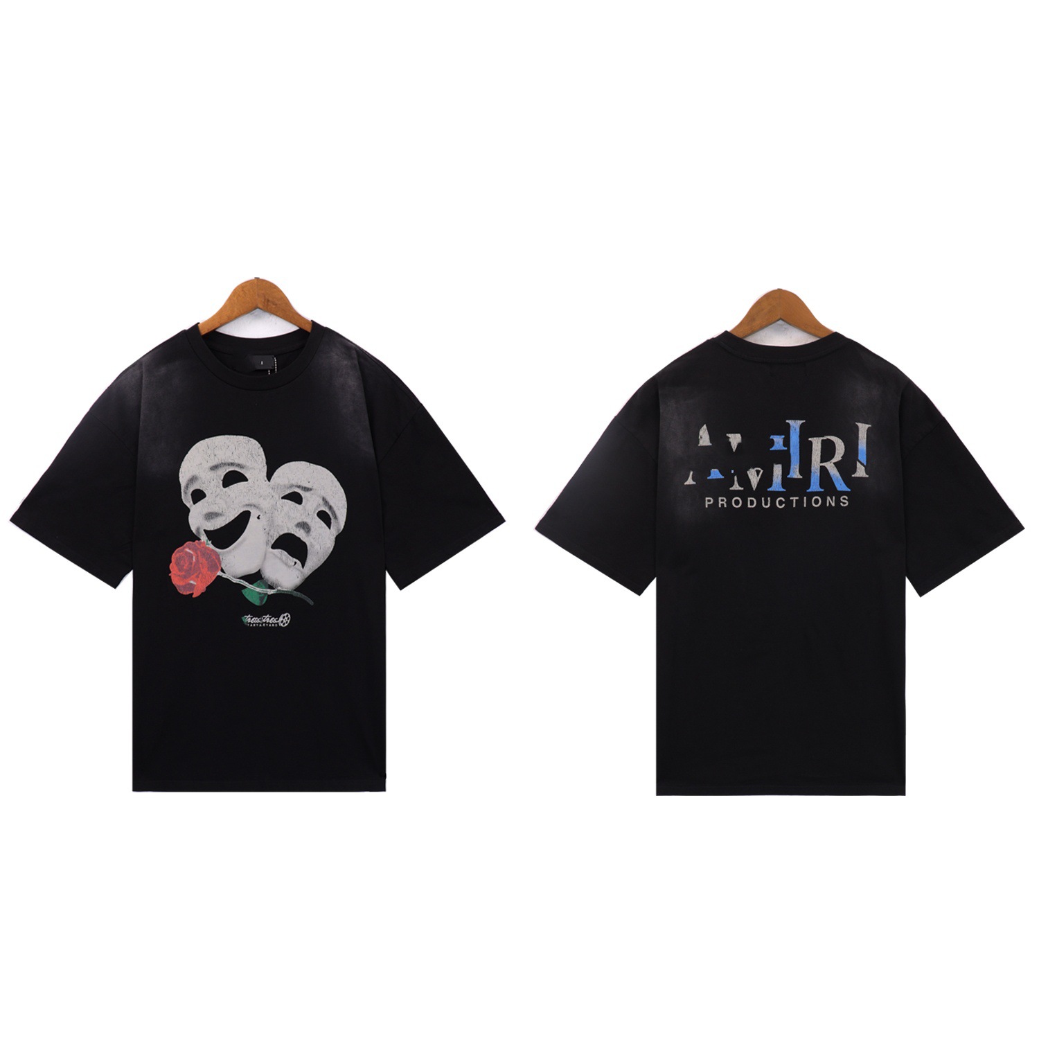 潮牌AMIRAII面具玫瑰花印花 男女个性宽松休闲短袖 青年卡通T恤衫