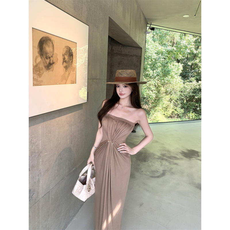 2025新款高级感纯色气质褶皱性感抹胸连衣裙女夏季收腰显瘦A字裙