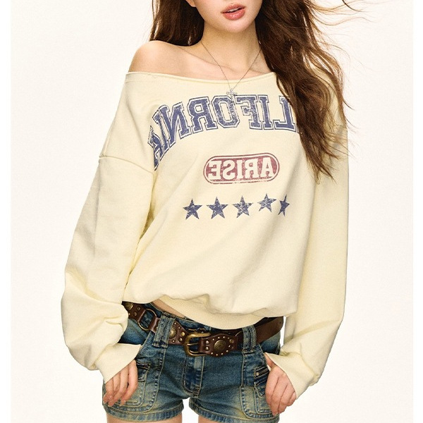 曼巴棉+原版做法美式星星印花黄色斜肩长袖卫衣女秋季上衣白色
