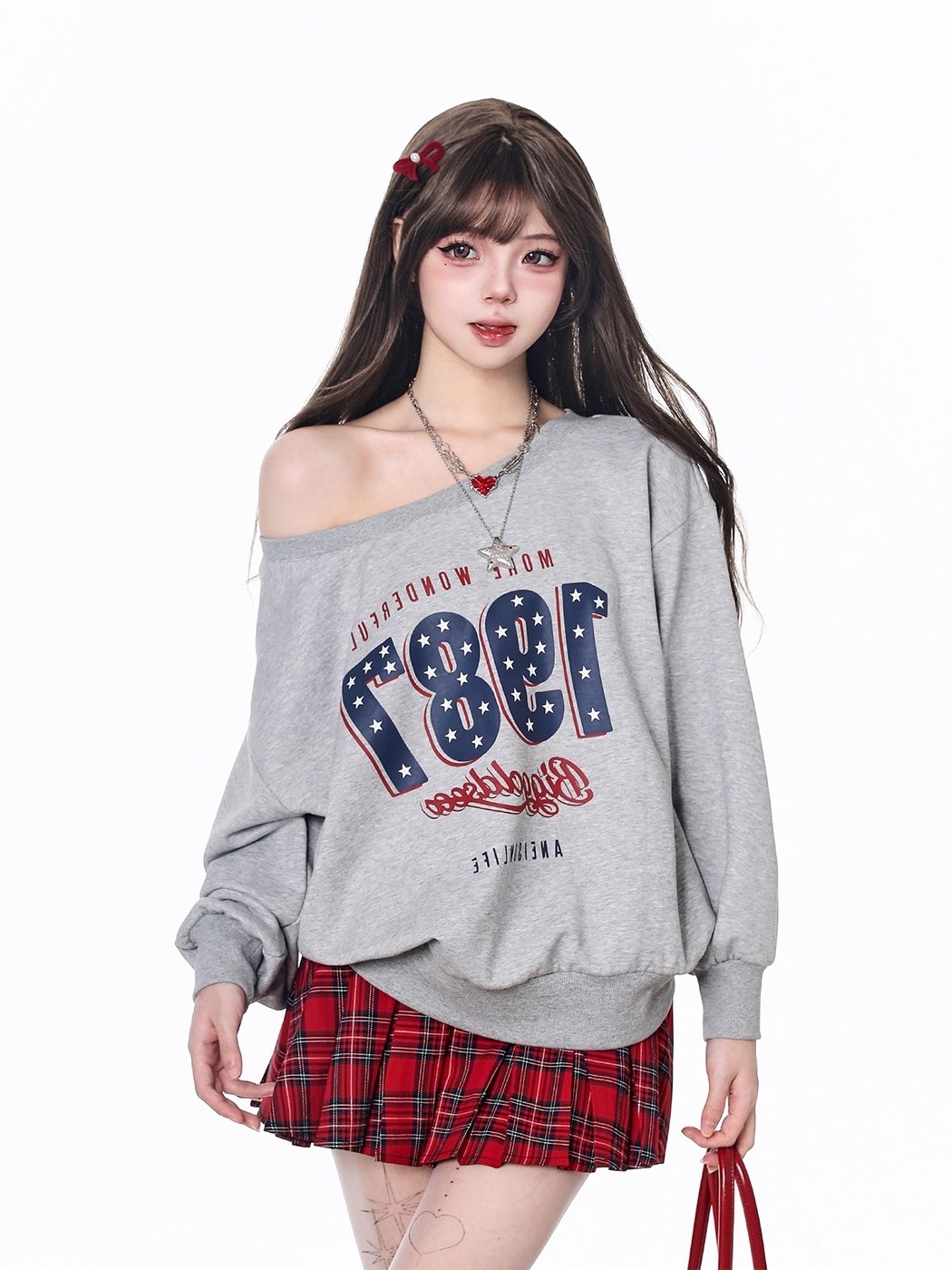 曼巴棉#美式复古字母印花斜肩卫衣女秋季新款宽松显瘦露肩上衣