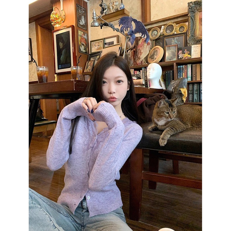 2025新款温柔风蕾丝花边长袖针织衫女装秋季法式气质百搭V领上衣