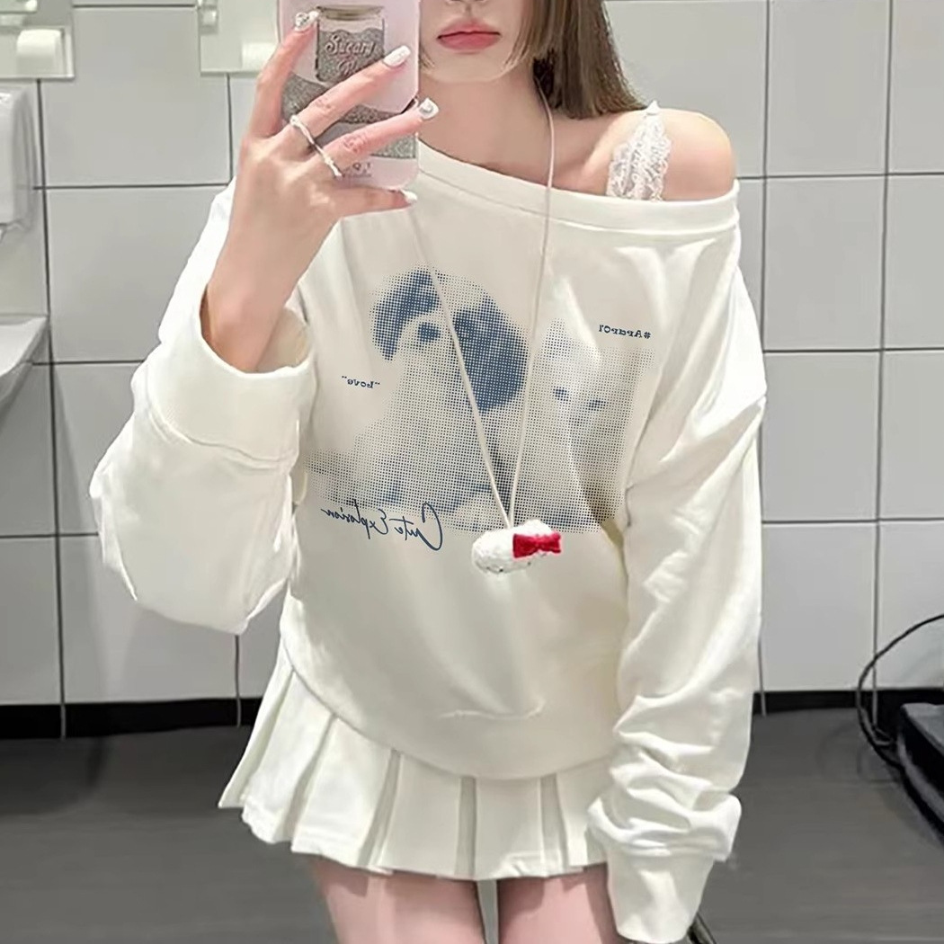 曼巴棉波点猫狗漏肩斜开肩卫衣女美式潮牌宽松秋冬情侣上衣白色