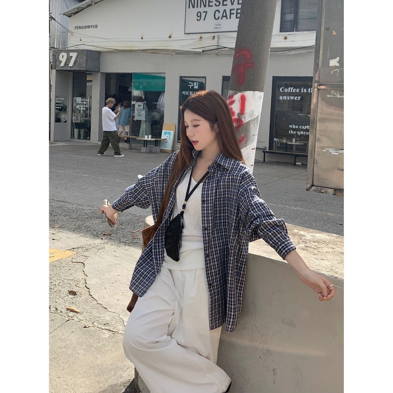 2025新款慵懒风蓝色格子翻领长袖衬衫女装秋季内搭显瘦背心两件套