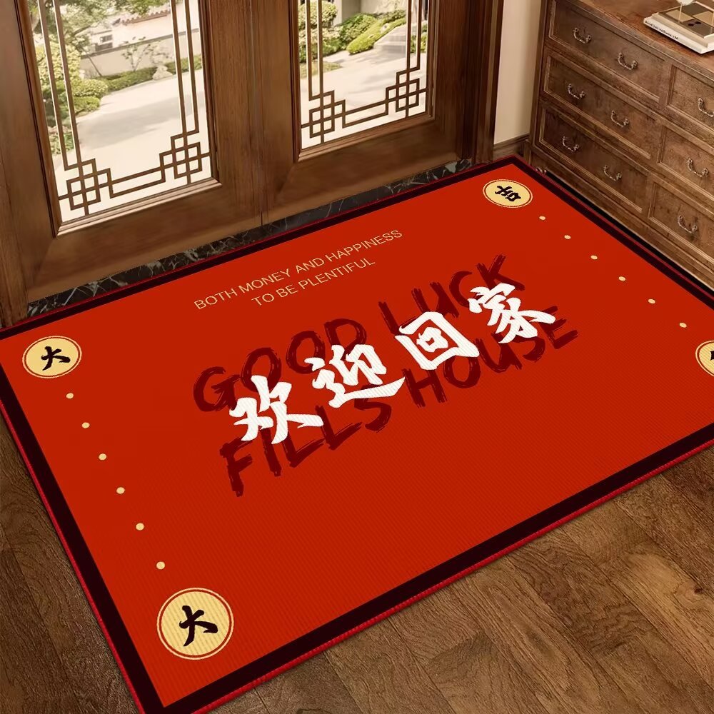 红色喜庆欢迎回家入户玄关门口耐脏易打理地垫水晶绒新年氛围感